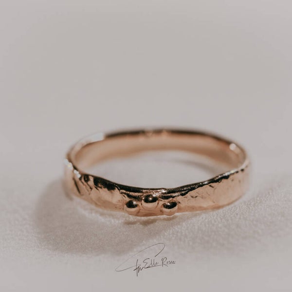 Een organisch gevormde, speelse en unieke ring in geelgoud, afgewerkt met drie fijne bolletjes die speels op de band rusten. De gepolijste afwerking laat het goud prachtig schitteren en benadrukt de levendige vormen van dit karaktervolle ontwerp.